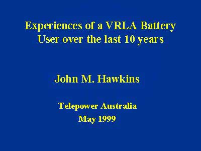 This afternoon, I am going to relate to you some of the experiences a relatively large telco in the use of VRLA batteries over the past 10 years or so. The focus is on VRLAs in standby use in telecommunications and UPS applications and I apologize in advance to those in the audience who have little interest in telecommunications batteries.