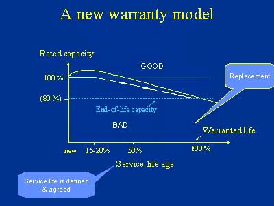 We define an end-of-life level that normal flags replacement. As a User I want a Yes-No curve. If at any time during the battery life I am above it, this is good. If I am below it, it is bad, and it is the manufacturers problem, not mine.